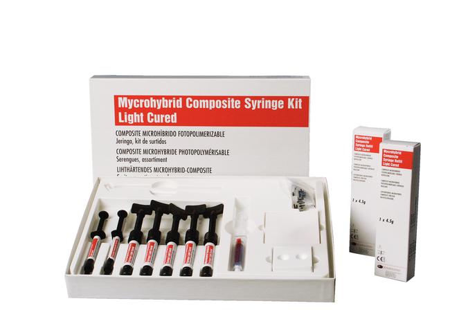 DE Healthcare Microhybrid is a Light Cured Microhybrid anterior and posterior filling material. Vita shaded. Small particle size provides strength and good aesthetics. Does not stick to instruments, condenses easily and can be carved. Syringes are available in 6 shades as well as universal opaque. Kit also contains 1x flowable composite, 1 x pit & fissure sealant, 1 x bond, 1 x etchant and application accessories.