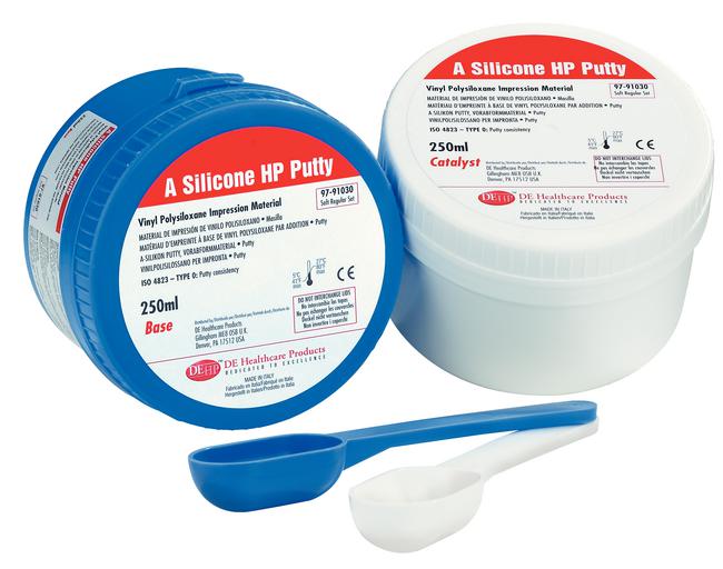 DE A Silicone HP Soft Putty. Precise in detail reproduction. Excellent mechanical properties (high tear strength, etc.), fast and regular setting, packaging of 800g / 500 ml each