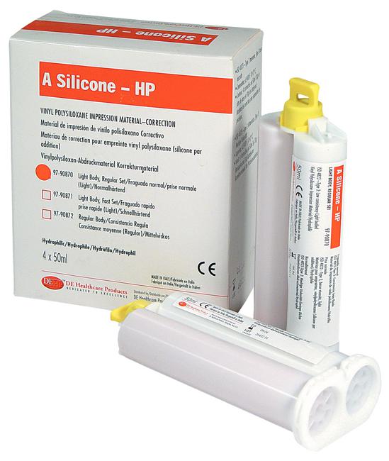 A Silicone HP correction materials: light and regular body, fast and normal setting, boxes with 2 x 50 ml double cartridges and mixing tips and economy pack of 4 x 50 ml double cartridges