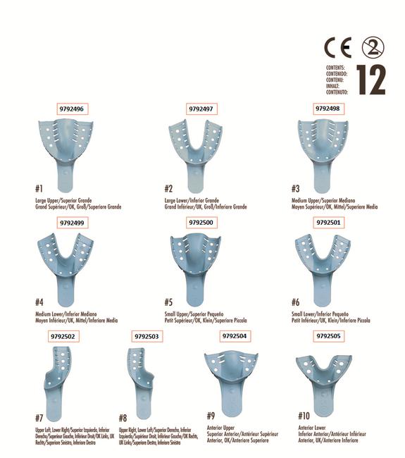Disposable Impression Trays. Perforated Strong, light-blue plastic-rigid, distortion free, pre-shaped, perforated impression trays. Fixed handle. Readily trimmed or flame softened for adjustments. Thermoplastic can be custom adjusted by heating or trimming. Compatible with cold sterilization and can be disinfected. Different sizes, 12 per pack.