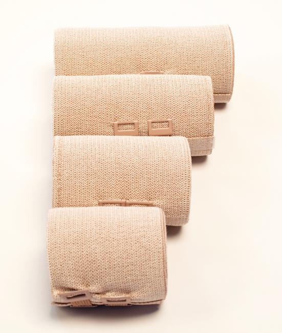 Heavy elastic compression bandage short stretch, leisured, lengthwise elastic, anti-slip, permeable to air and absorbent, resistant against fat, ointment, oil and sweat, low static pressure, high working pressure. 5 m, different widths, LF skin, packaging with 10 bandages each