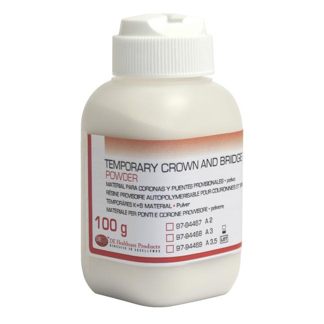 Self curing powder and liquid material for temporary crown and bridges. Very good physical properties and therefor suitable for long-term transitional temporaries. Esthetic results. Fast and easy to mix. Mixing ratio 2:1 . High plaque resistance through smooth surface. Biocompatible and very low residual monomer content. Powder. Content: 100g. Color: A2